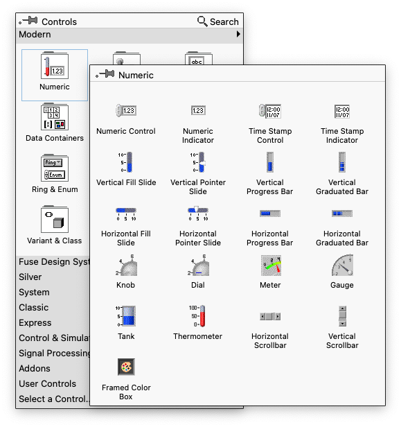 프론트패널에 넣을 수 있는 각종 요소들이 표시된 창이 나와요.